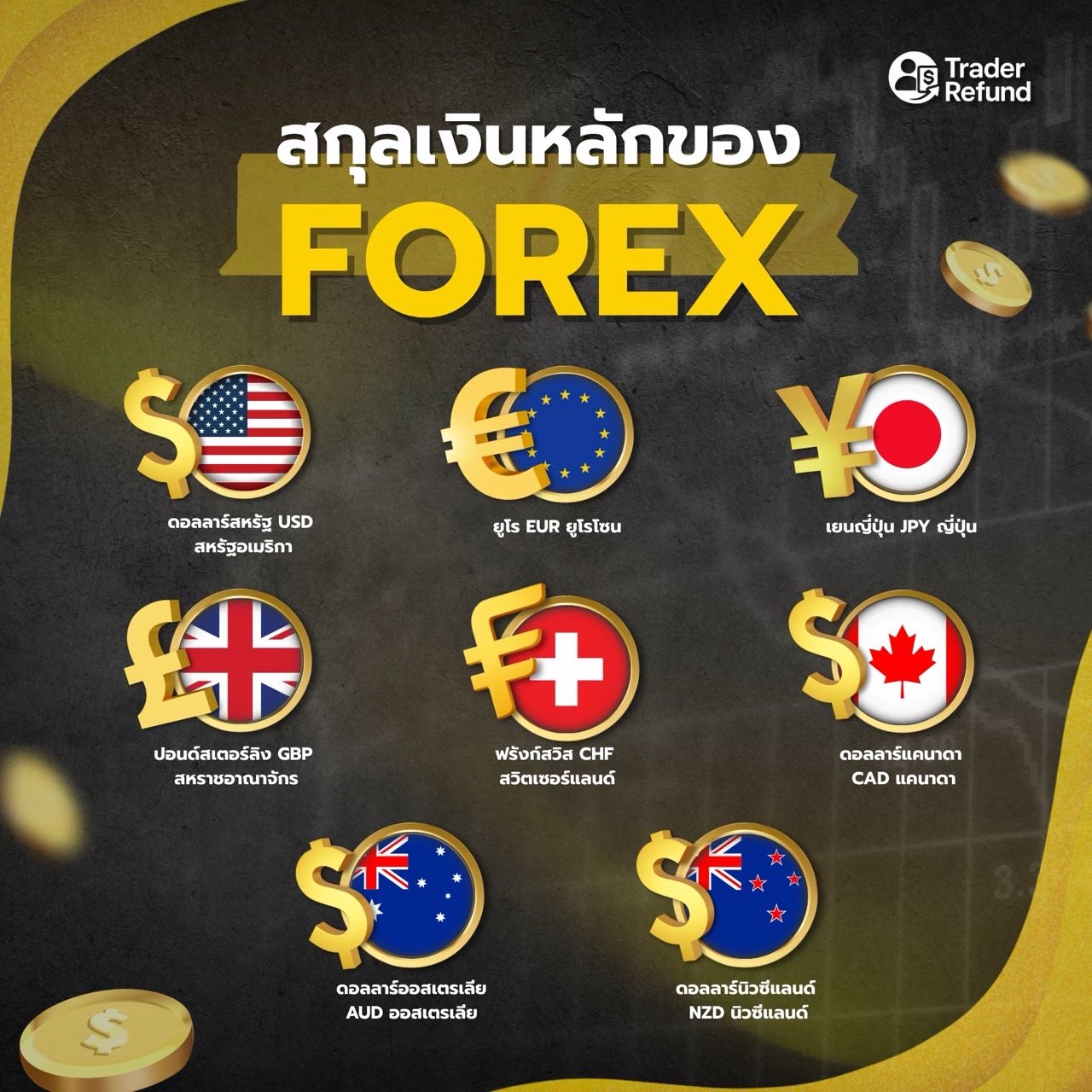 สกุลเงินหลักของตลาด Forex มีทั้งหมด 8 สกุล ได้แก่